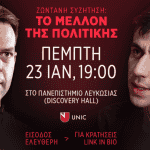 Η συζήτηση με θέμα «Το μέλλον της πολιτικής» θα φιλοξενηθεί στο Πανεπιστήμιο Λευκωσίας στις 23 Ιανουαρίου.