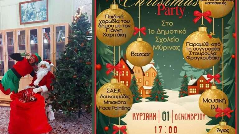 Ο Σύλλογος Γονέων και Κηδεμόνων του 1ου Δημοτικού Σχολείου Μύρινας υποδέχεται τον μήνα των Χριστουγέννων με μια μεγάλη χριστουγεννιάτικη γιορτή για μικρούς και μεγάλους αυτήν την Κυριακή, 1 Δεκεμβρίου στις 17:00 στο 1ο Δημοτικό Σχολείο Μύρινας.