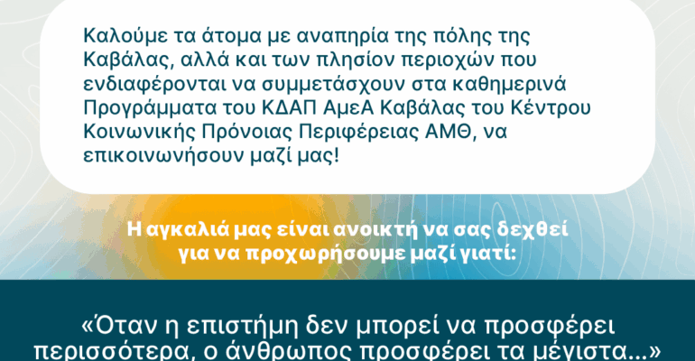Το Κέντρο Κοινωνικής Πρόνοιας Περιφέρειας Α.Μ.Θ. προσκαλεί άτομα με αναπηρία από την Καβάλα και τις γύρω περιοχές να συμμετάσχουν σε ένα περιβάλλον δημιουργίας, στήριξης και κοινωνικής ένταξης.