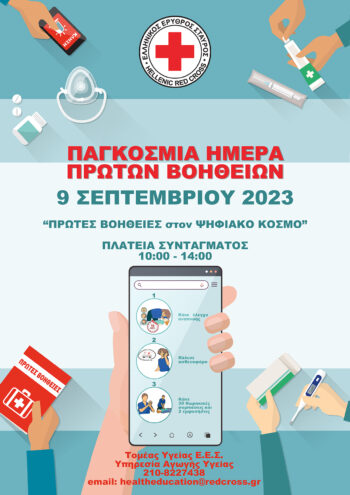 Ο Ελληνικός Ερυθρός Σταυρός, στο πλαίσιο του εορτασμού της Παγκόσμιας Ημέρας Πρώτων Βοηθειών (9/9), διοργανώνει το Σάββατο (9/9) και ώρες 10-2 μ.μ., μεγάλη δράση στην Πλατεία Συντάγματος (πλησίον του Μετρό), στοχεύοντας στην ανάδειξη της σπουδαιότητας γνώσης πρώτων βοηθειών σε ενήλικες και παιδιά.