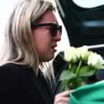 Κρατώντας λίγα λευκά τριαντάφυλλα στα χέρια, η Πόπη Δομάζου πλησίασε και φίλησε το φέρετρο, που ήταν τυλιγμένο με τη σημαία του Παναθηναϊκού.