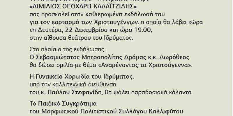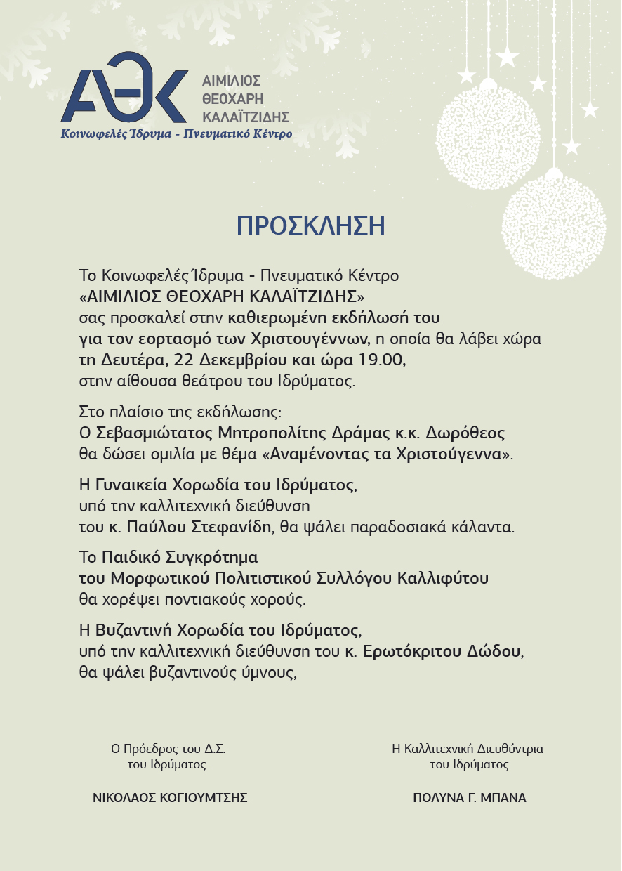 Πρόσκληση στη χριστουγεννιάτικη εκδήλωση του Ιδρύματος «Αιμίλιος Θεοχάρη Καλαϊτζίδης»