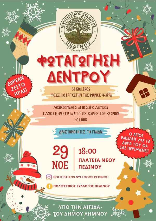 ΣΗΜΕΡΑ Το Πεδινό ανάβει το Χριστουγεννιάτικο Δέντρο του με μια γιορτή γεμάτη χαρά και αρώματα γιορτών!