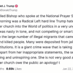 Αργότερα, προχώρησε περισσότερο, γράφοντας στην πλατφόρμα του Truth Social: «Η αποκαλούμενη Επίσκοπος που μίλησε στην Εθνική Προσευχή την Τρίτη το πρωί ήταν μια σκληροπυρηνική αριστερή που μισεί τον Τραμπ. Ήταν αγενής στο τόνο της, ούτε πειστική ούτε έξυπνη… Αυτή και η εκκλησία της οφείλουν δημόσια συγγνώμη!»