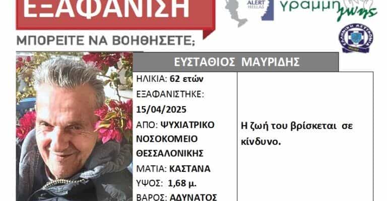 Συναγερμός για εξαφάνιση 62χρονου από Ψυχιατρικό Νοσοκομείο της Θεσσαλονίκης