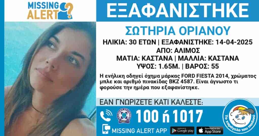 Συναγερμός για την εξαφάνιση της 30χρονης Σωτηρίας Οριανού από τον Άλιμο – Άμεσος κίνδυνος για τη ζωή της