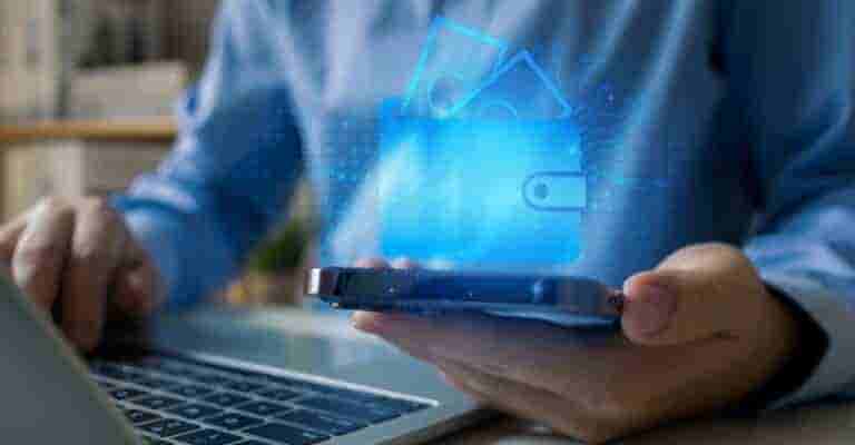 εικόνα που δείχνει άνδρα να πληκτρολογεί και να τσεκάρει στην οθόνη του κινητού το ψηφιακό πορτοφόλι