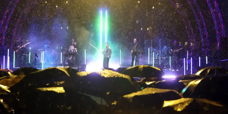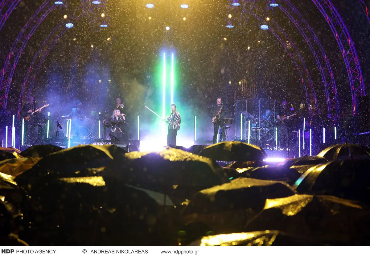 Σύνταγμα – Φωταγωγήθηκε το δέντρο με καταρρακτώδη βροχή και τον Μουζουράκη στη σκηνή