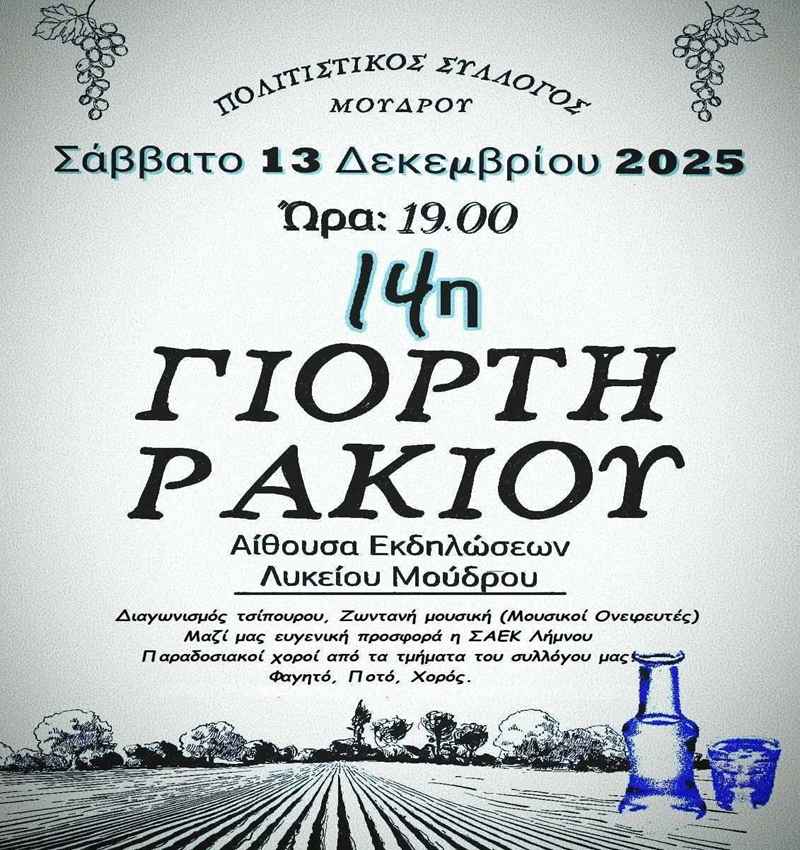 Θα γίνει χαμός στον Μούδρο, η 14η Γιορτή Ρακιού επιστρέφει με άρωμα παράδοσης και μήνυμα έμπνευσης!