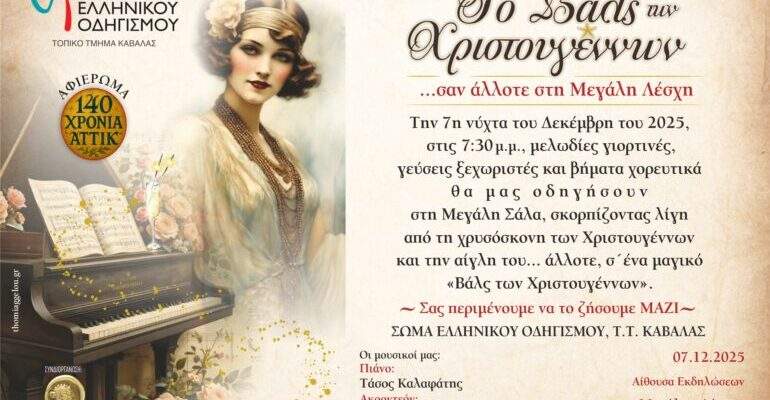 Το Σώμα Ελληνικού Οδηγισμού, Τοπικό Τμήμα Καβάλας, ετοιμάζει μια ξεχωριστή μουσική χριστουγεννιάτικη βραδιά με τίτλο «Το Βαλς των Χριστουγέννων …σαν άλλοτε στη Μεγάλη Λέσχη», την Κυριακή 7 Δεκεμβρίου 2025, στις 7:30 μ.μ., στην Αίθουσα Εκδηλώσεων της Μεγάλης Λέσχης (Κύπρου 12, Καβάλα).