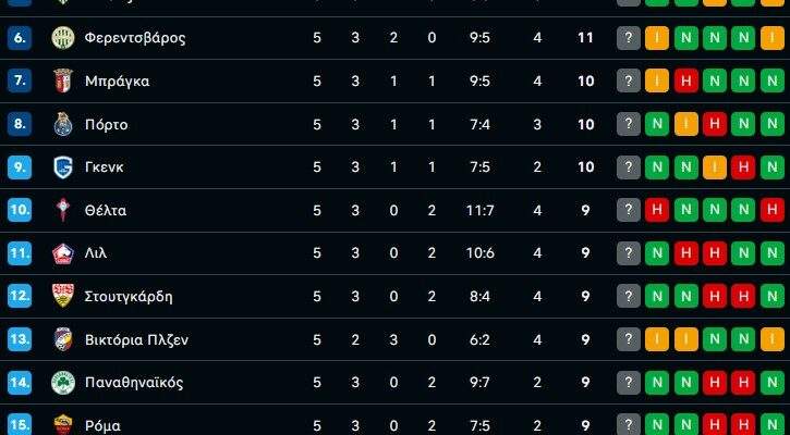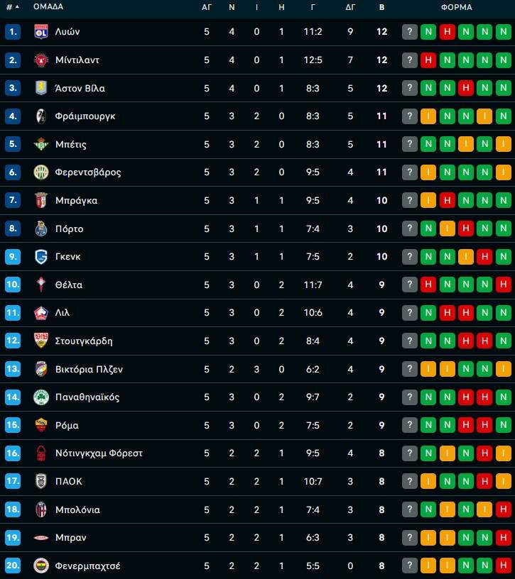 Βαθμολογία Europa League: Οι θέσεις Παναθηναϊκού και ΠΑΟΚ μετά την 5η αγωνιστική