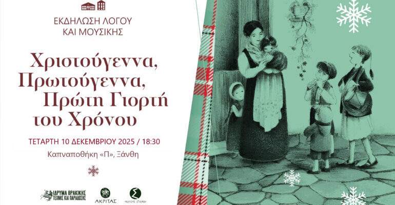 Το Ίδρυμα Θρακικής Τέχνης και Παράδοσης, σε συνεργασία με τις Εκδόσεις Ακρίτας και το Βιβλιοπωλείο Σπανίδη, ανοίγουν το εορταστικό τους πρόγραμμα με μια ιδιαίτερη χριστουγεννιάτικη εκδήλωση λόγου και μουσικής, με τίτλο «Χριστούγεννα Πρωτούγεννα, Πρώτη Γιορτή του Χρόνου».