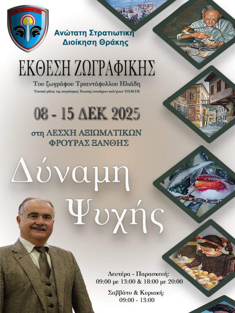 Η Ανώτατη Στρατιωτική Διοίκηση Θράκης διοργανώνει έκθεση ζωγραφικής με τίτλο «Δύναμη Ψυχής» του ζωγράφου Τριαντάφυλλου Ηλιάδη, τακτικού μέλους της Παγκόσμιας Ένωσης Αναπήρων Καλλιτεχνών V.D.M.F.K., στη Λέσχη Αξιωματικών Φρουράς Ξάνθης.