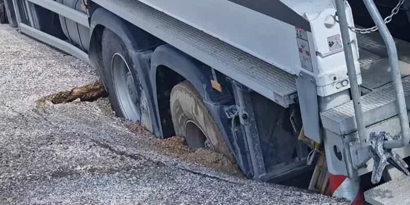 Υποχώρησε η άσφαλτος στη Θεσσαλονίκη και «κατάπιε» φορτηγό – Δείτε βίντεο