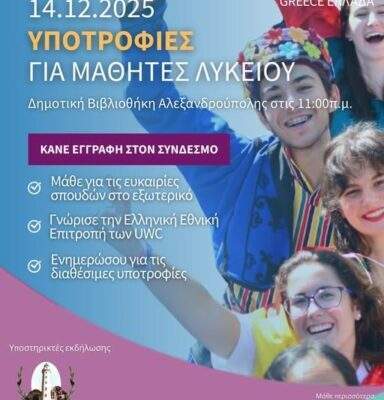 Υποτροφίες για μαθητές Λυκείου από την Ελληνική Εθνική Επιτροπή UWC – Ενημερωτική παρουσίαση στην Αλεξανδρούπολη